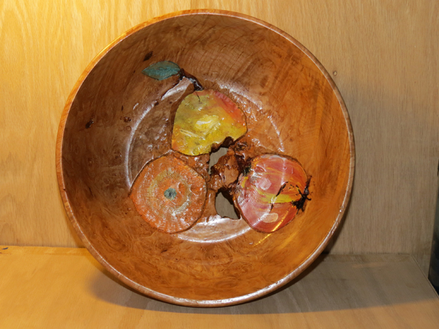 I sculpt a pear, an apple and an orange with the nuts from the maple...